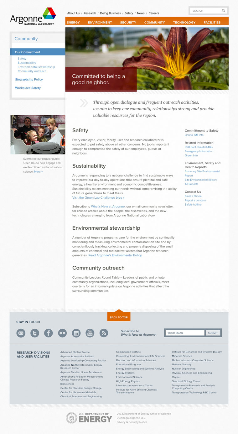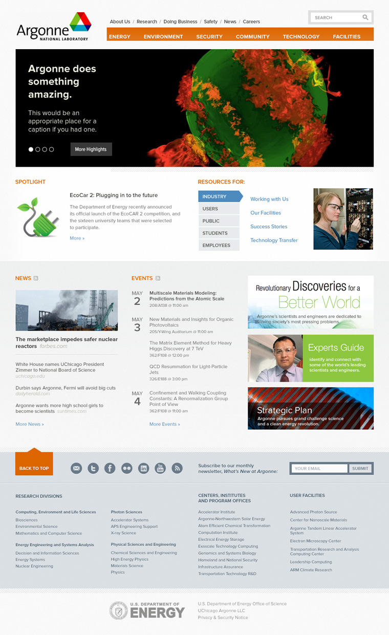 The most impactful project I worked on was towards the end of my tenure — a full redesign of Argonne’s primary website. Several web folks from across the lab joined forces to envision a new web presence, which hadn't been updated significantly for several years. It was a big challenge to satisfy the many stakeholders involved, and wrangle the enormous amount of content and needs for a large organization.