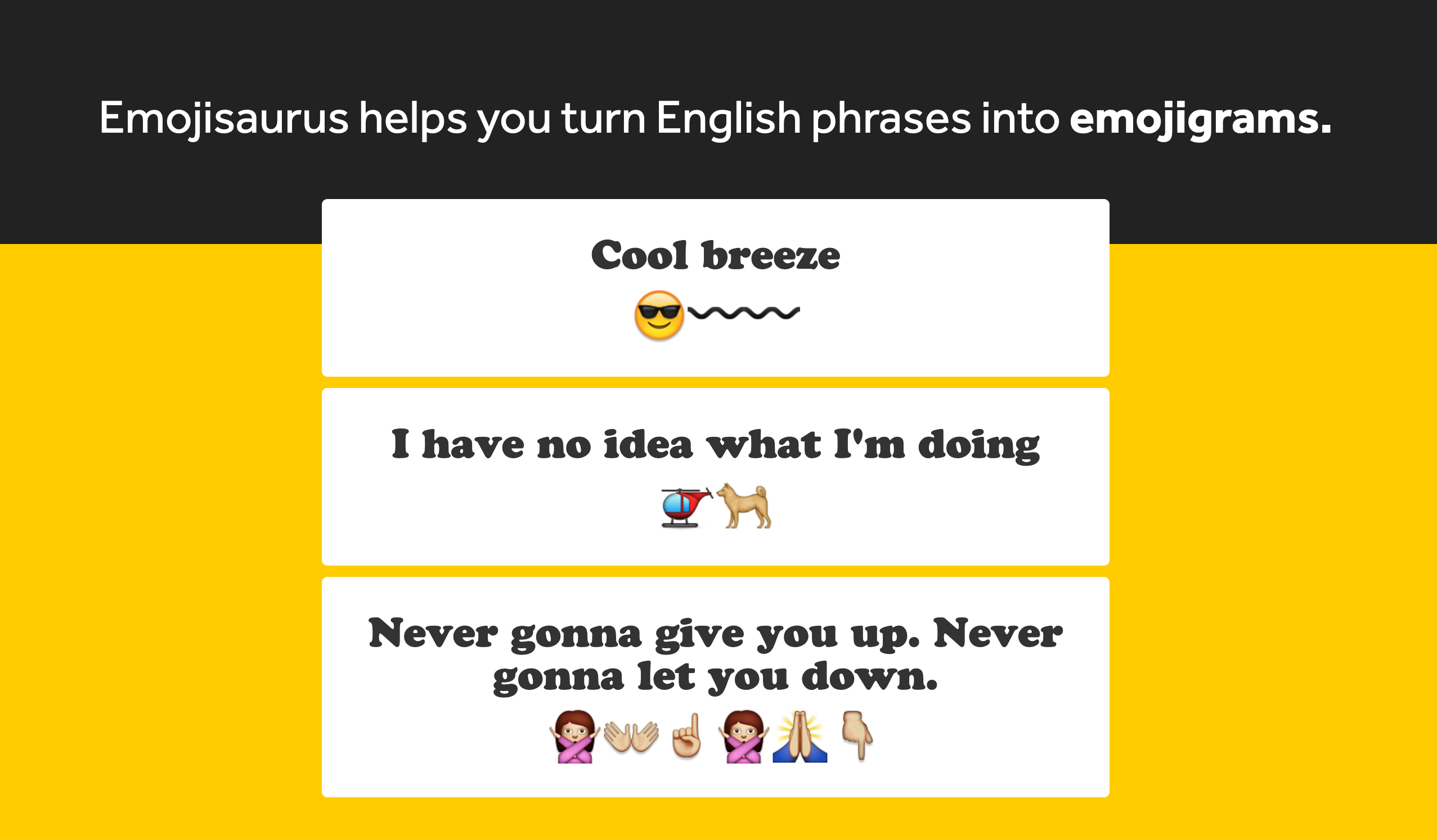 Jamie Dihiansan, Javan Makhmali, Trevor Turk, and I joined forces and spent a couple days at the office, hacking away at a silly app that showed user-submitted translations of emoji glyphs into English sentences (and vice versa). We called these “emojigrams.”
